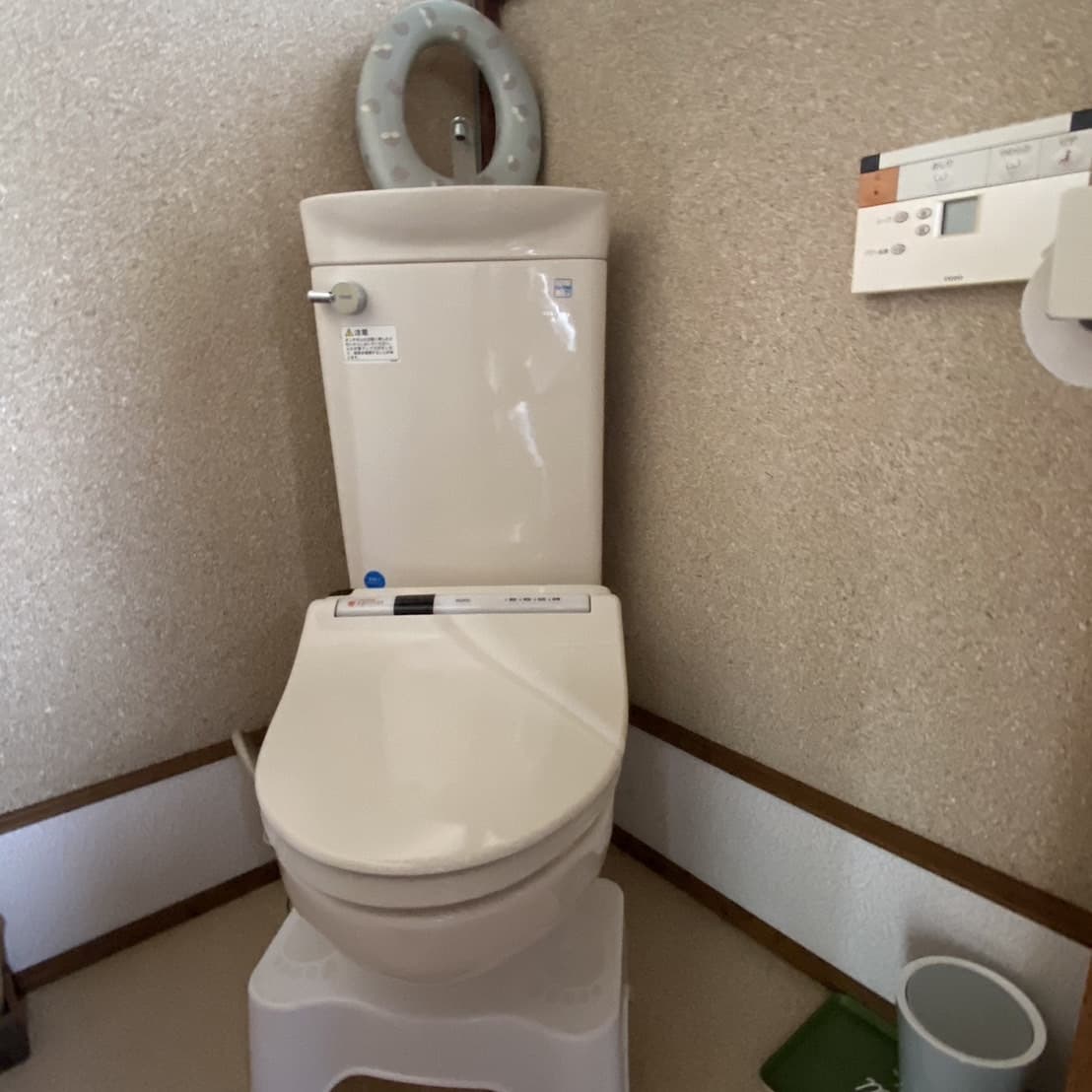 洋式水洗トイレ。子ども用ステップと便座あり。